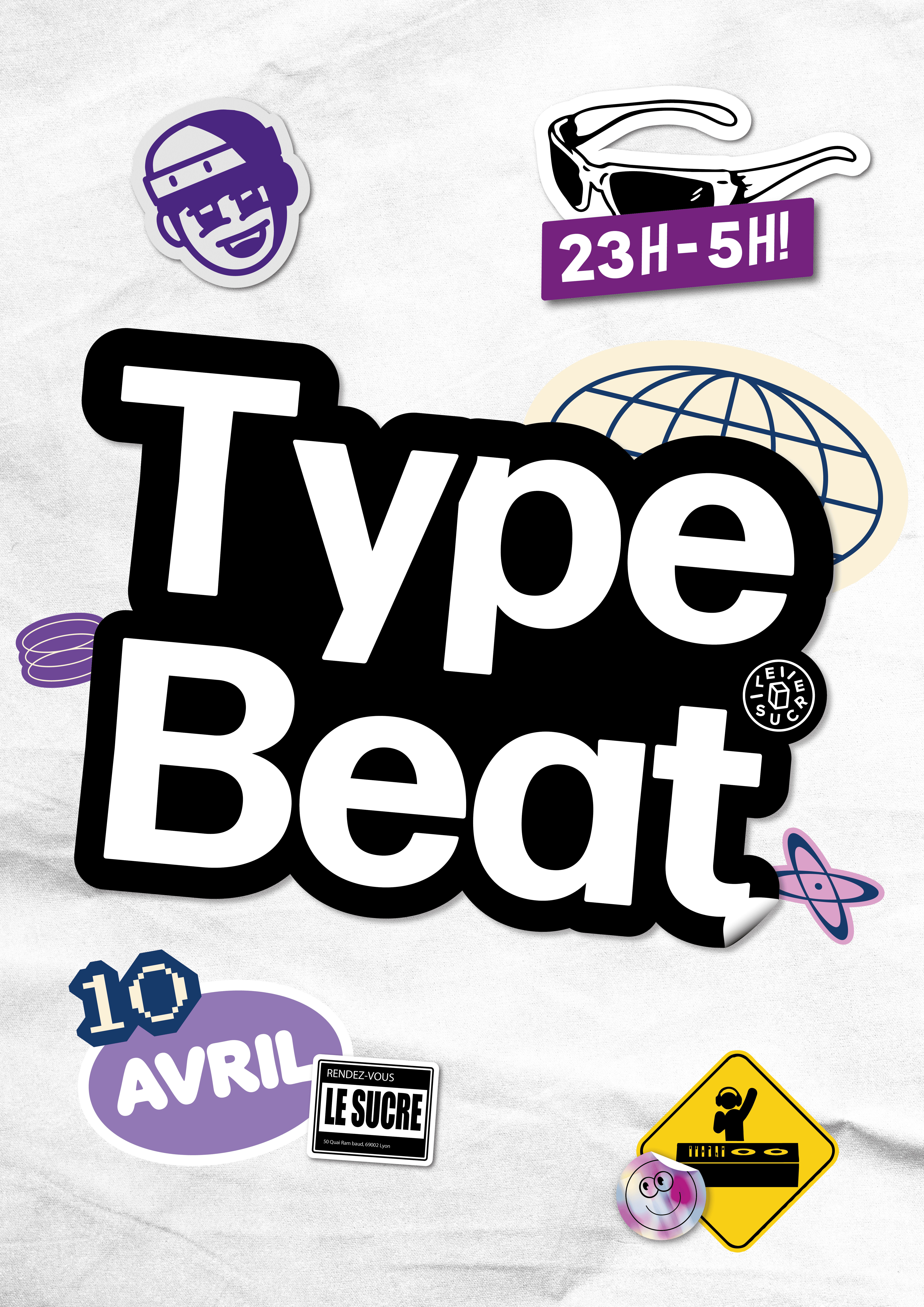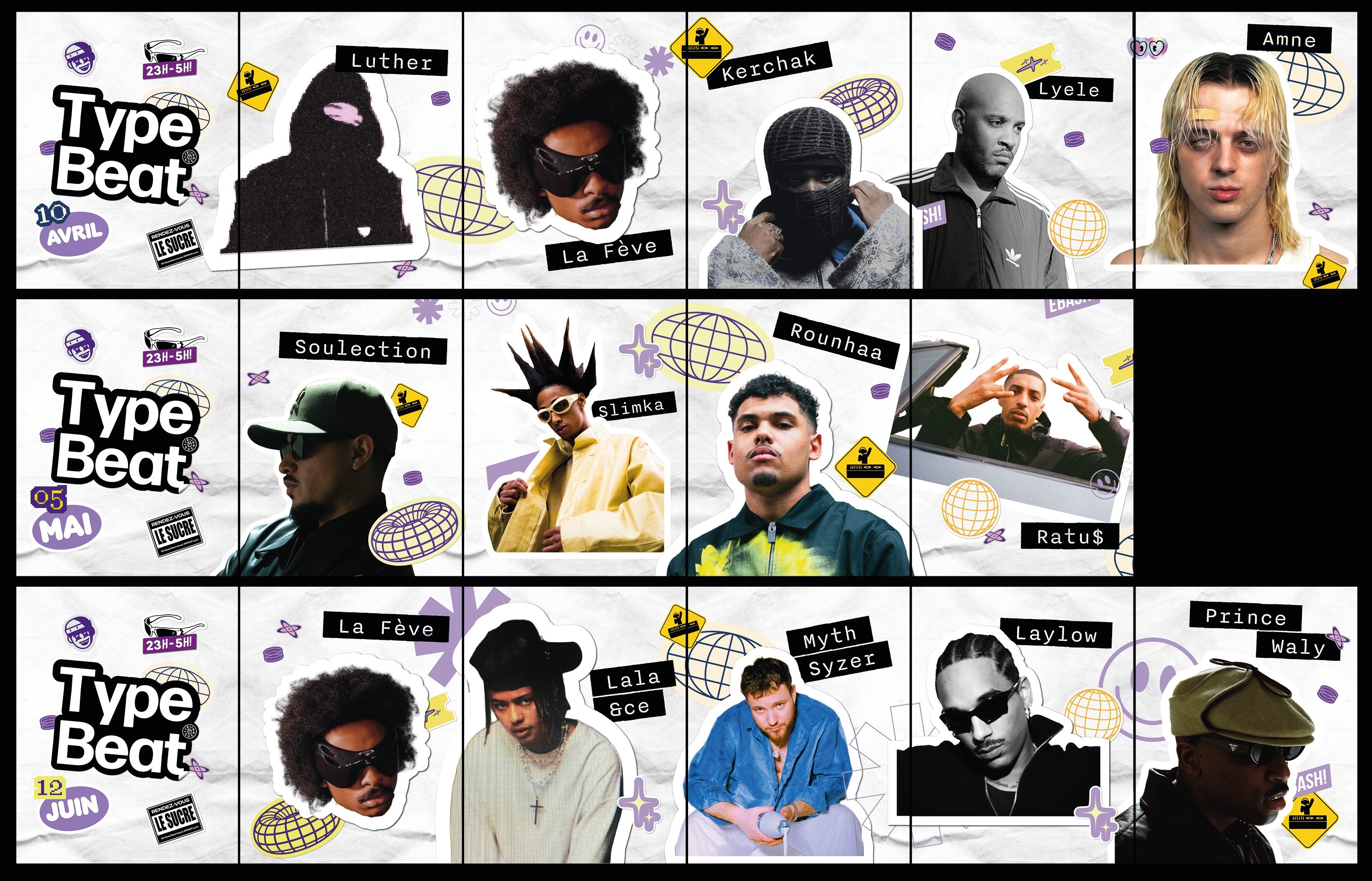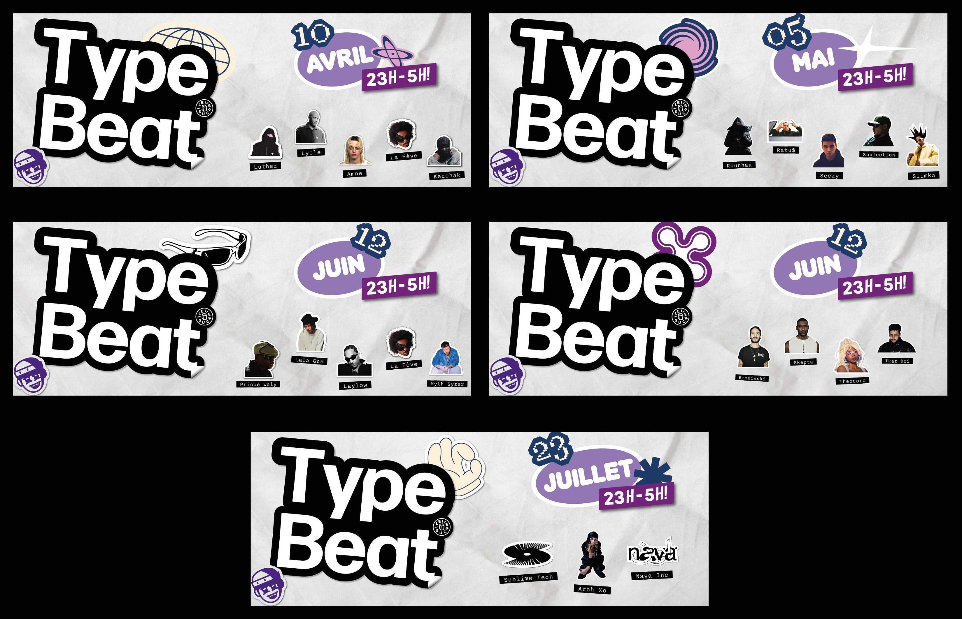 The elements of our identity were designed to function as stickers. The aim of this choice is significant, drawing direct inspiration from beat tags, those signature sounds, that beatmakers slip into their tracks to make them easily identifiable. All these elements are layered, creating a collage aesthetic rooted in hip-hop culture. Ultimately, this identity functions like a beatmaker’s tag, with a visual identity that is immediately recognizable.