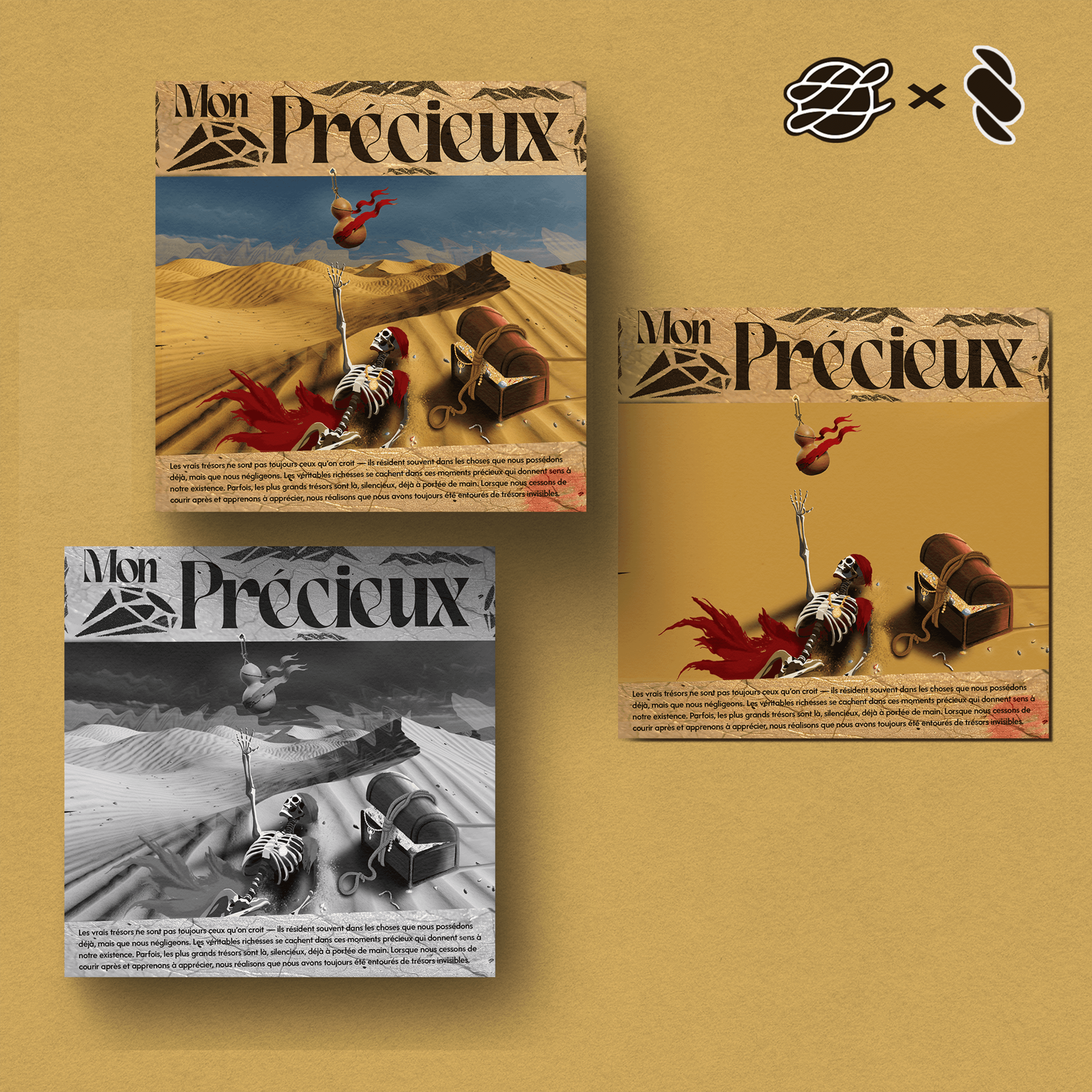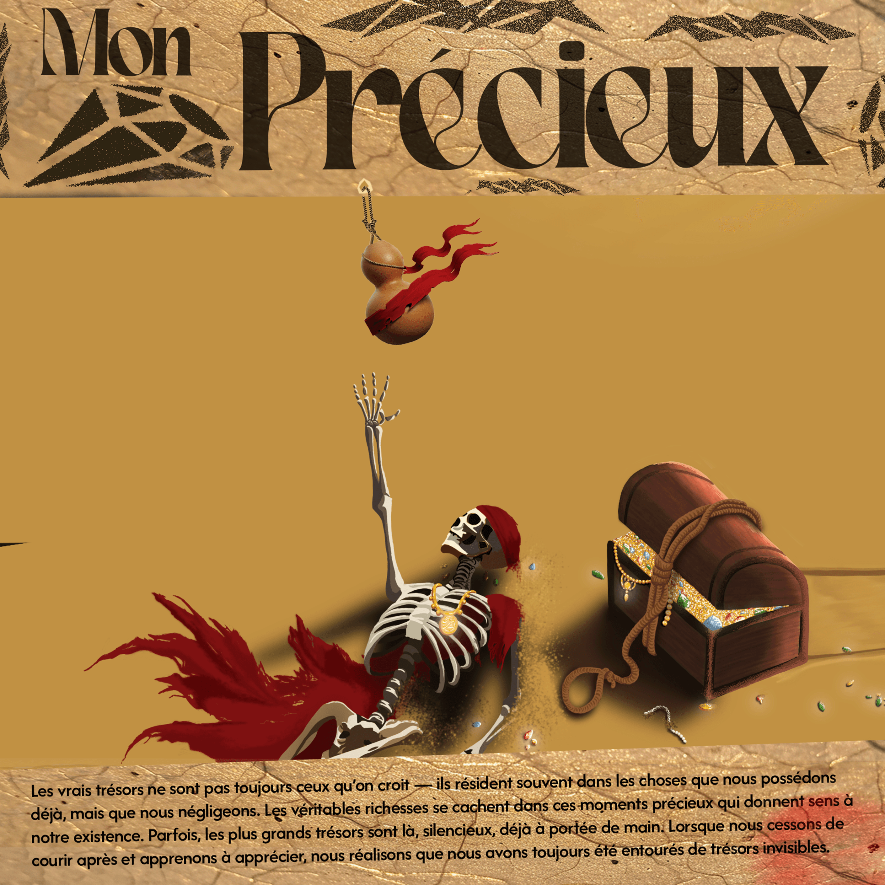 This project with @rel.verse questions the true value of things. We imagined a pirate skeleton lying in the desert, covered in jewels, with a chest overflowing with treasures beside him... but he desperately reaches out for a simple water bottle, symbolizing a vital need overshadowed by the illusion of material wealth.